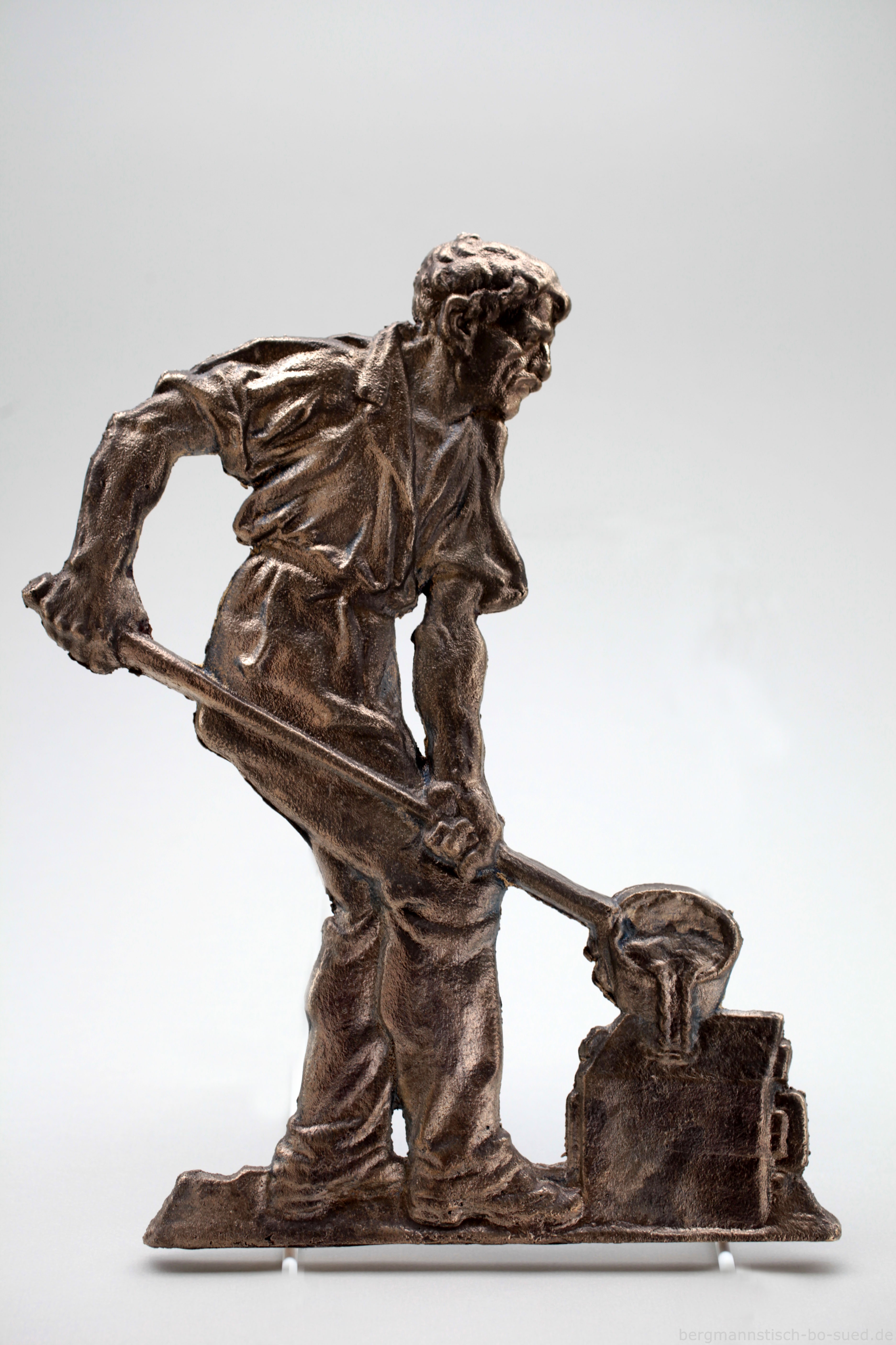 Wie auch kleinere Teile entstehen konnte an dem frisch gegossenen Andenken (Arbeiter mit Gußpfanne), das glatt poliert jetzt in der