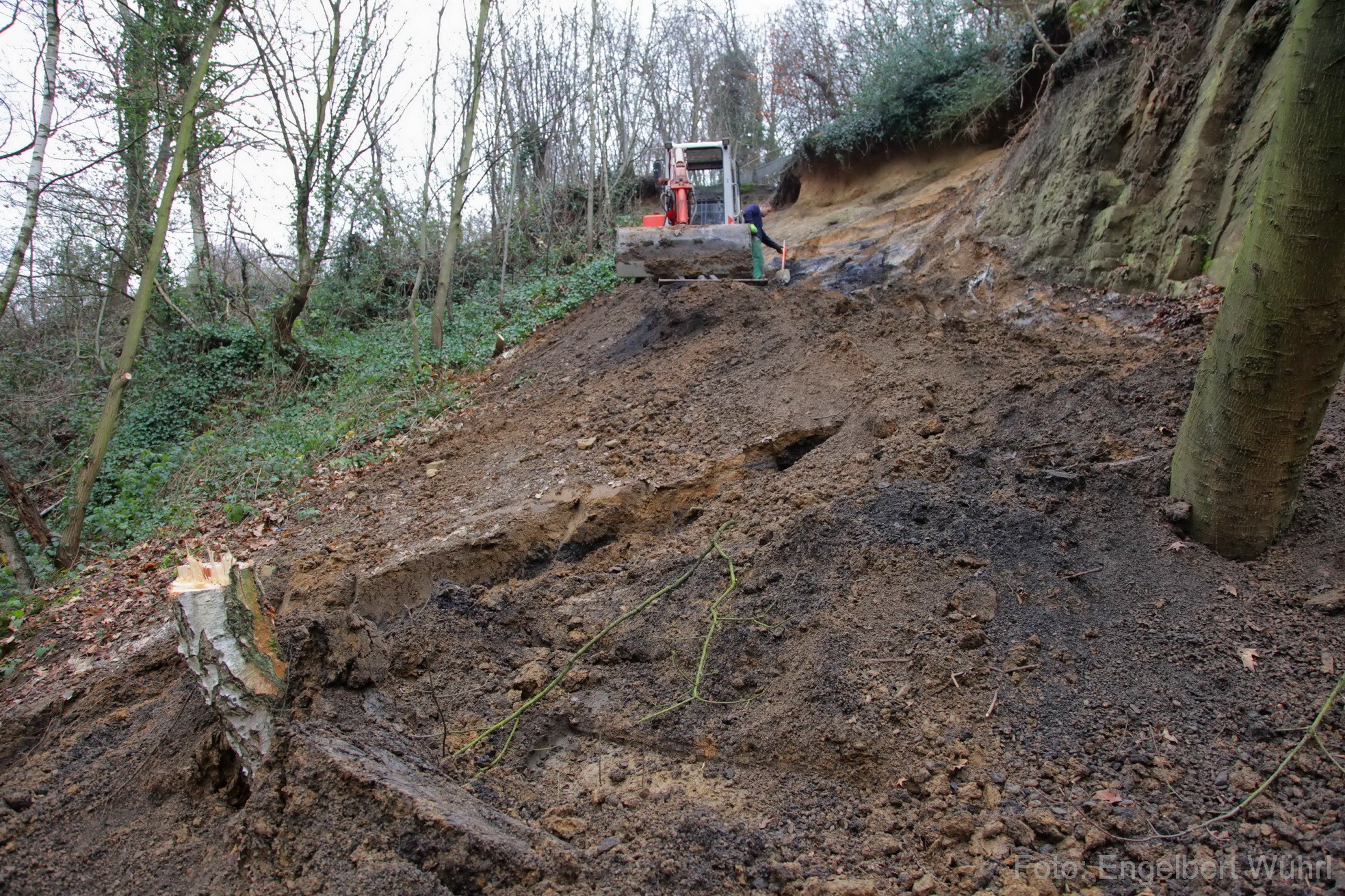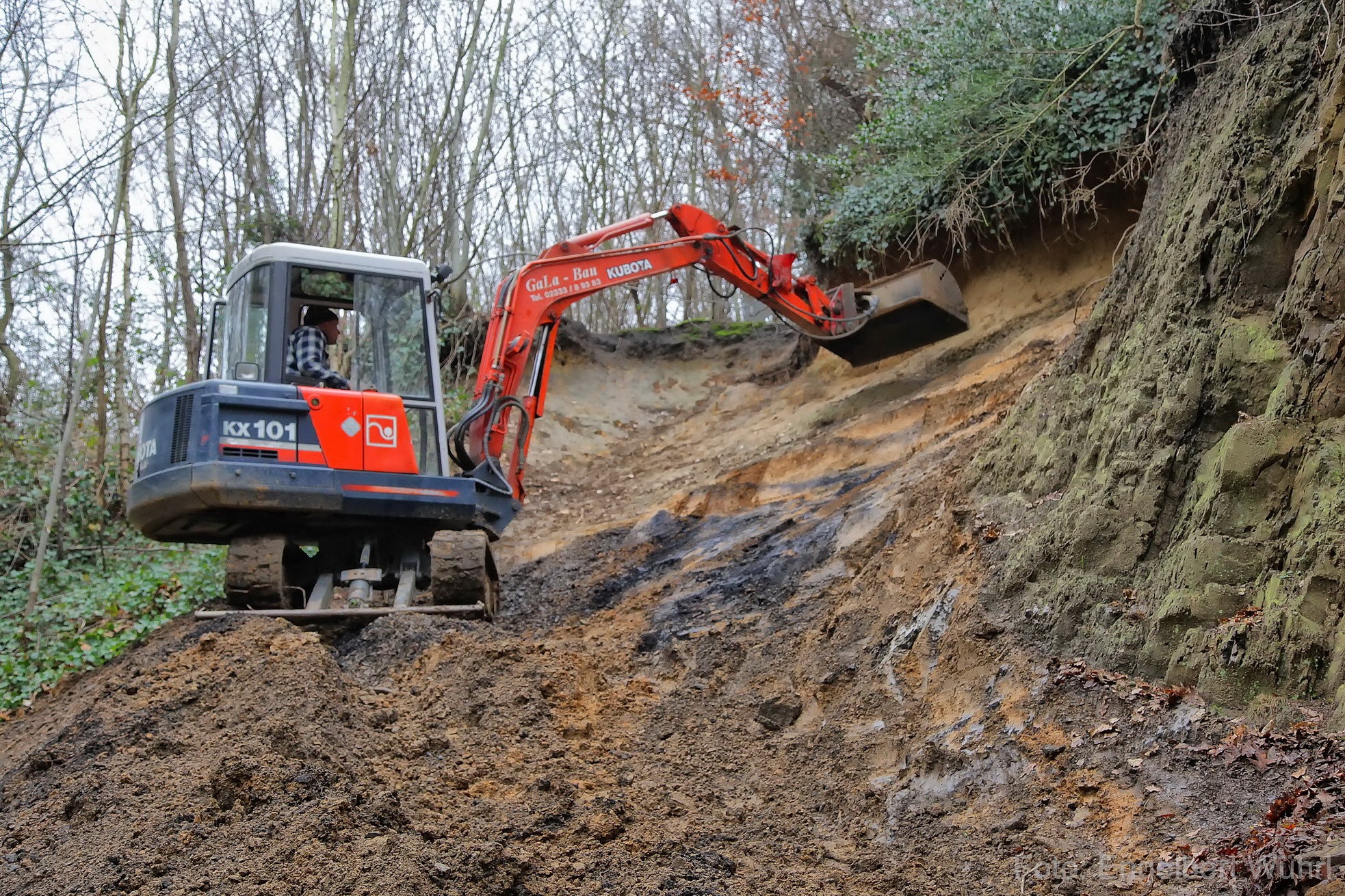 Auch wenn es nicht so steil erscheint; bei dem Job sind Baggerfahrer ohne Nerven gefragt. Die Position des Baggers wird erst richtig klar, wenn man das Ergebnis der Arbeiten sieht.
