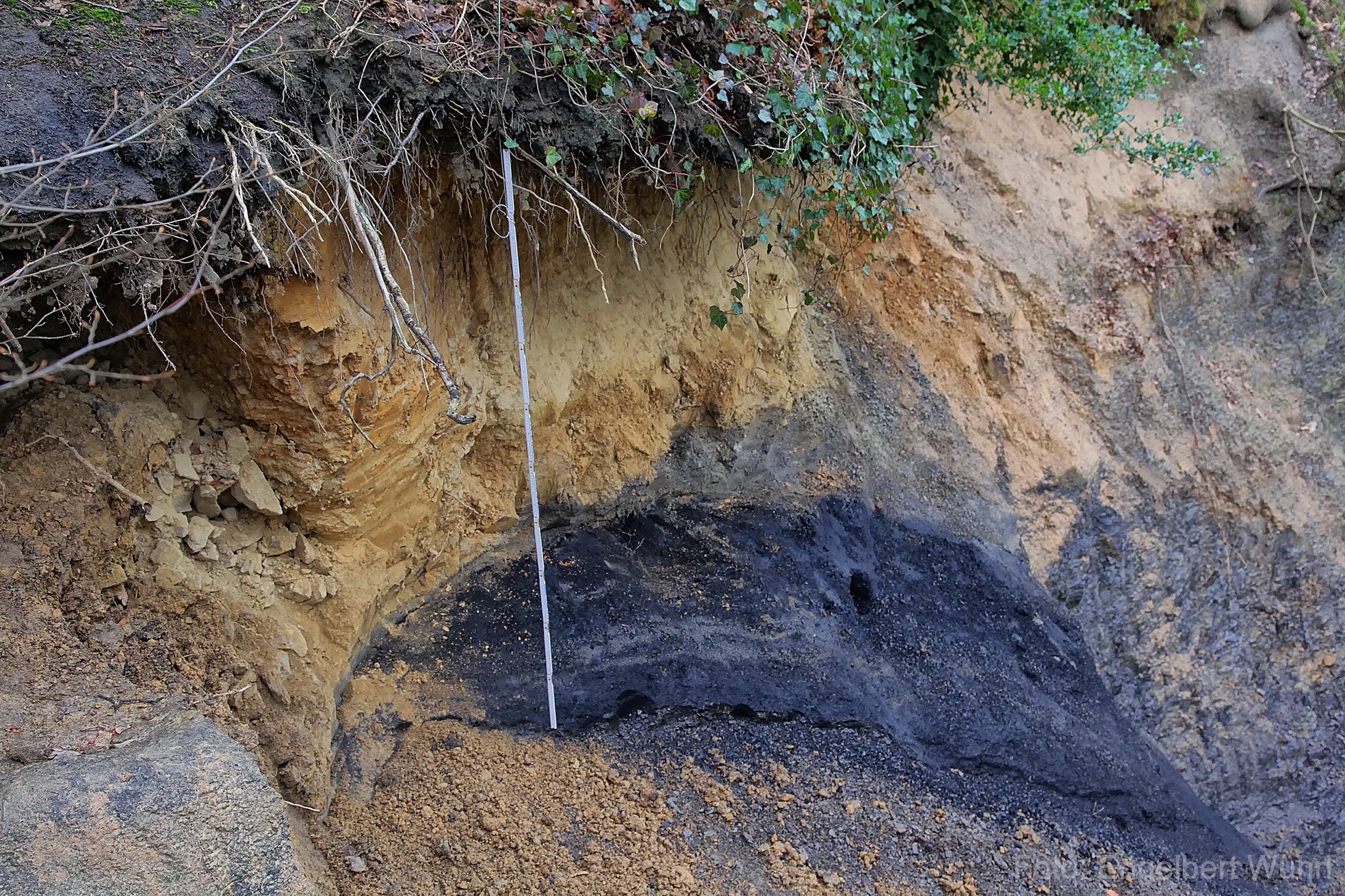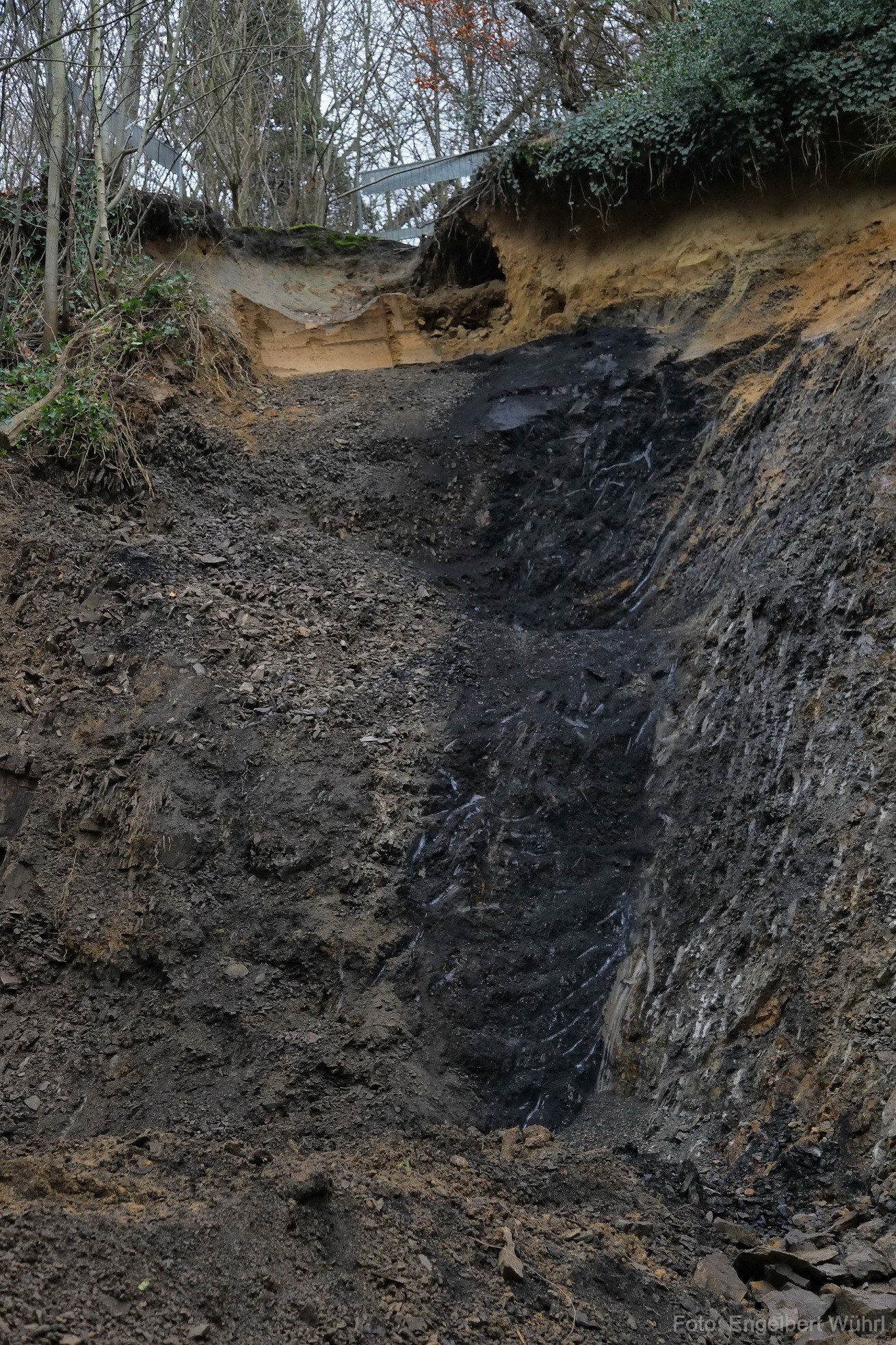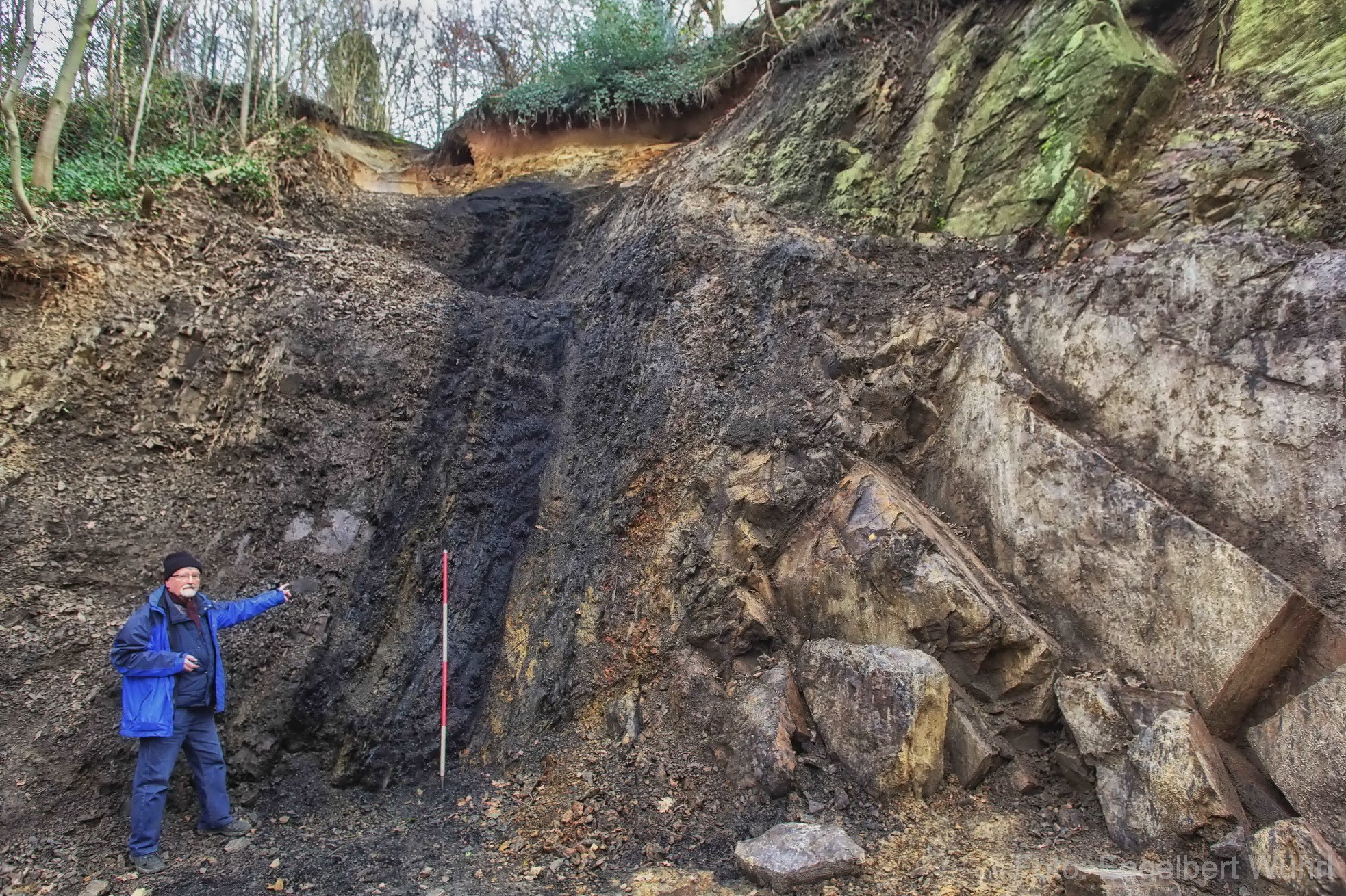 an der Lewacker Straße. Das mächtige Flöz, das hier zutage tritt, war von einem Schuttkegel komplett bedeckt, der jetzt im Auftrag