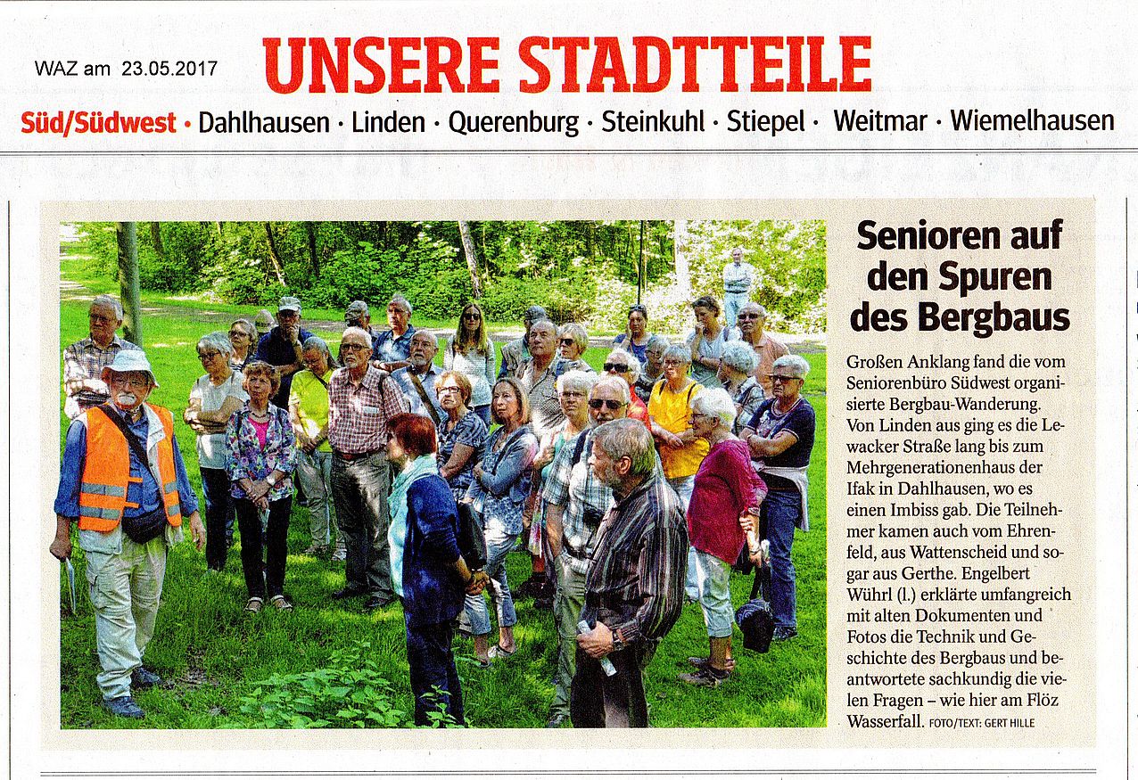 Seit Jahren werden Führungen auf Teilstücken des Lehrpfades angeboten. Das Angebot wird u.a. auch vom Seniorenbüro der Stadt Bochum genutzt. Am 17. Mai war eine 38 Personen starke Gruppe unterwegs, durchweg sehr gut zu Fuß. Die Strecke begann am Röderschacht und ging über die alte Bahntrasse bis zum Bahnhof Dahlhausen. Von dort ging es noch zum Mehrgenerationenhaus an der Eiberger Straße.