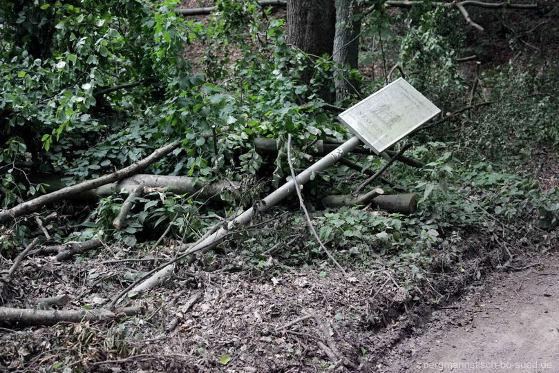 Durch extreme Regenmengen gelangte Wasser unter die Plexiglasscheibe, die die Infotafeln schützt. Durch Schimmel und Verfärbungen kann es zum Austausch der Tafel kommen; problematischer ist die mögliche Schädigung der Holzkonstruktion.