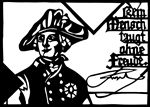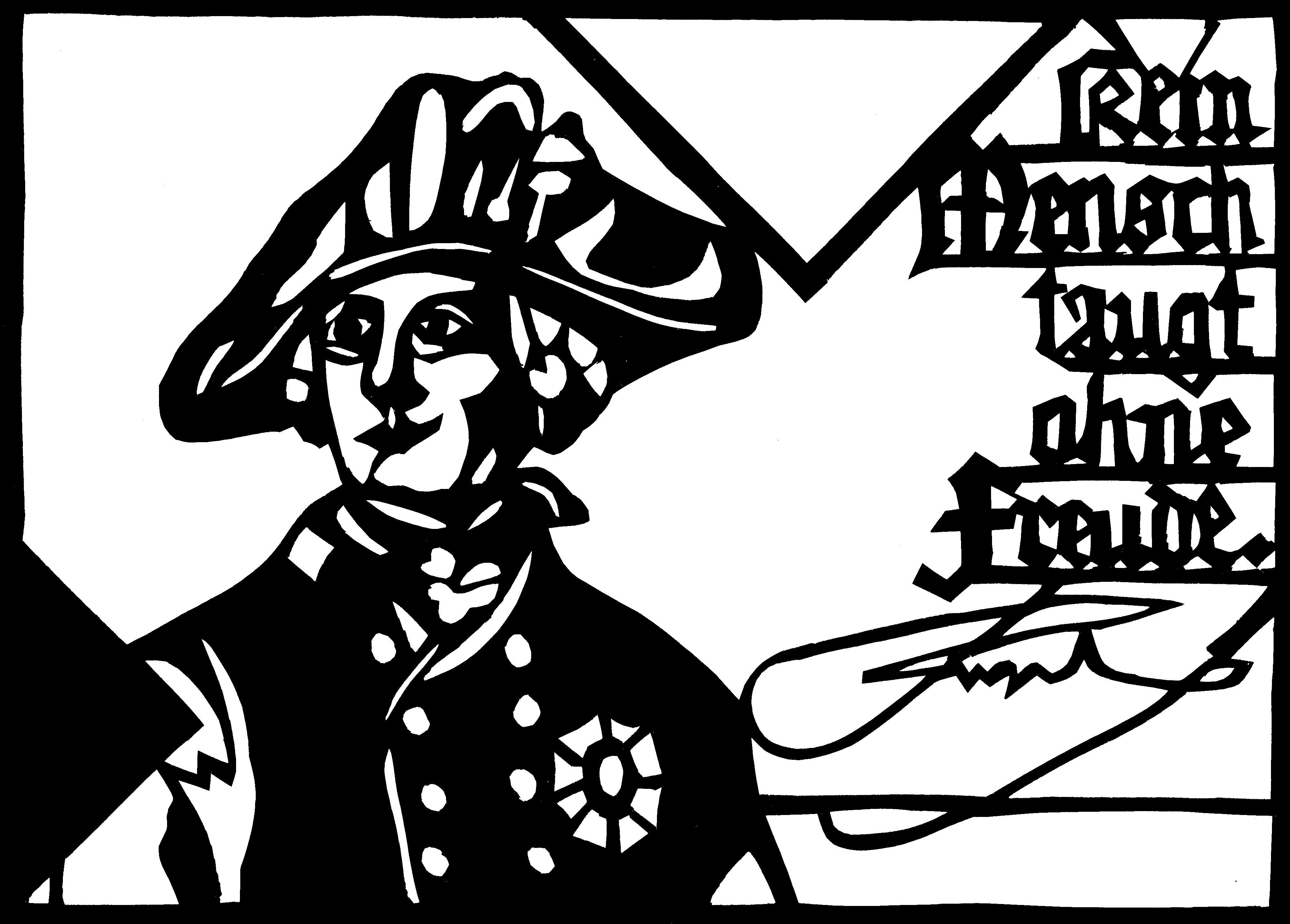 Man sollte meine Scherenschnitt-Entwicklungs-Kurzgeschichte nicht zu ernst nehmen. Viel besser ist es, sich an der Wandprojektion als Ergebnis der Vielfalt der Ausdrucks– und Gestaltungs-Möglichkeiten zu erfreuen. Welche Bilderschwemme ist um uns?! Die von mir gewählte Darstellungsweise quasi wie ein gerahmtes Bild mit zusammenhängenden Bildelementen, das sind die wesentlichen einschränkenden Voraussetzungen bei meiner Motivauswahl- und Schneidearbeit in der gewählten einheitlichen Bildgröße. Die Vorgaben durch den damals im Sitzungszimmer des Bergwerks Monopol vorhandenen Overhead–Projektor (noch nach alter amerikanischer Norm), führten zur Festlegung meiner Scherenschnitt-Größe in dem den allgemeinen Sehgewohnheiten entsprechenden Querformat. Die damals gewählten Bildmasse habe ich bis heute beibehalten. Die Außenabmessungen meiner Scherenschnitte entsprechen dem Format DIN A4. Zu manchen möglichen Gelegenheiten schicke ich Bekannten, Freunden und Verwandten aus den vorhandenen oder für sie entworfene besondere Scherenschnitte, gestaltete DIN A5-Drucke, aber auch auf Postkartengröße verkleinerte Bilder mit meinen Glückwünschen oder Grüßen. Aber: Da ich vor über 80 Jahren in Ostpreußen geboren wurde, folgt für mich logisch, das Erinnern an den Preußenkönig Friedrich II., dessen Geburt vor 300 Jahren erfolgte.