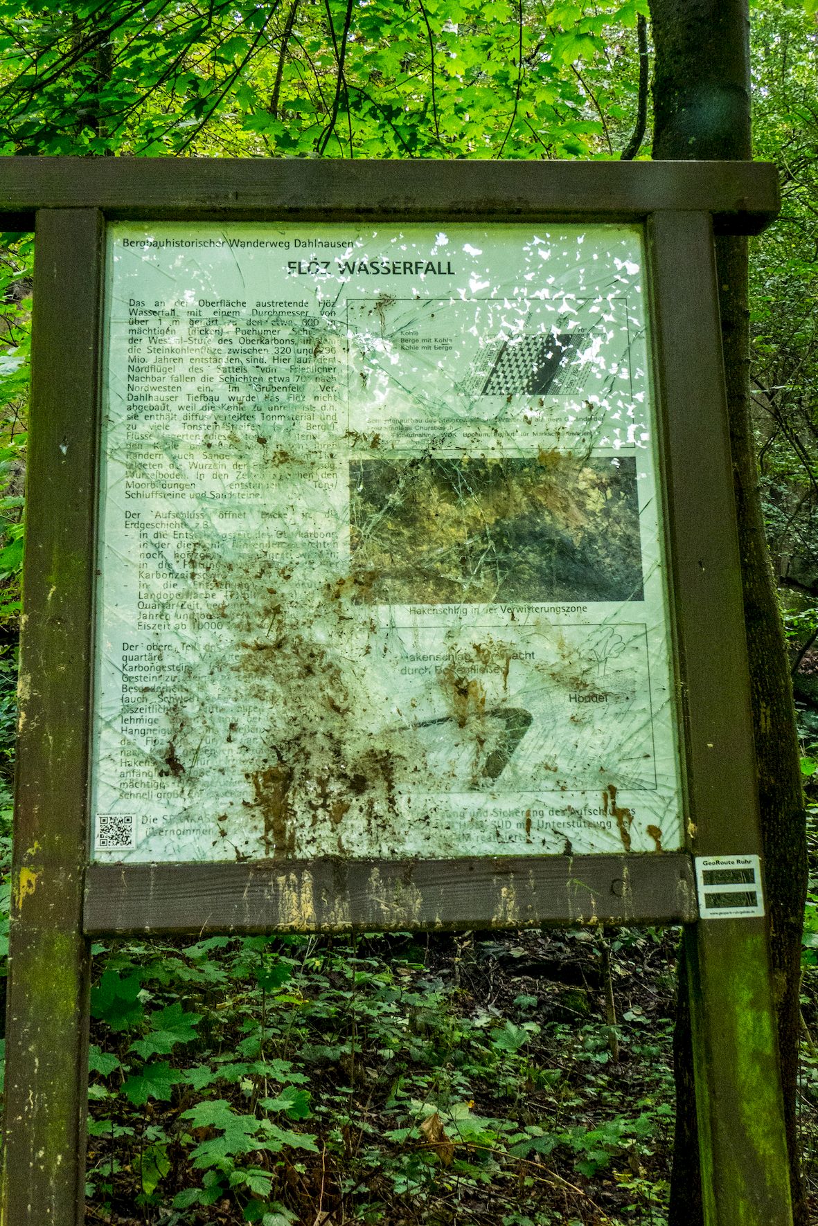 Beschmierte Infotafel mit Aufkleber.