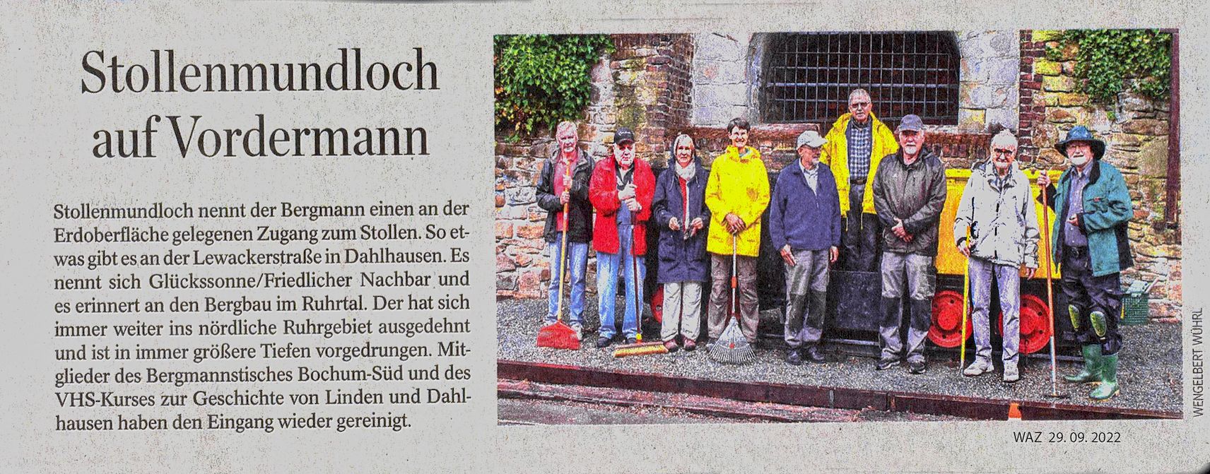 Mehrere Male pro Jahr wird das Stollenmundloch gesäubert, der Bewuchs zurückgeschnitten und die Fläche davor von Unkraut befreit. Die Grubenlok mit dem Kohlewagen wird abgewaschen und falls notwendig auch neu angestrichen. 2012 wurde auch die Einfassung der Fläche an der rechten Seite erneuert. Diese Aktion könnte auch die Vorlage zum Drehbuch von "Ewig grüßt das Murmeltier" sein.